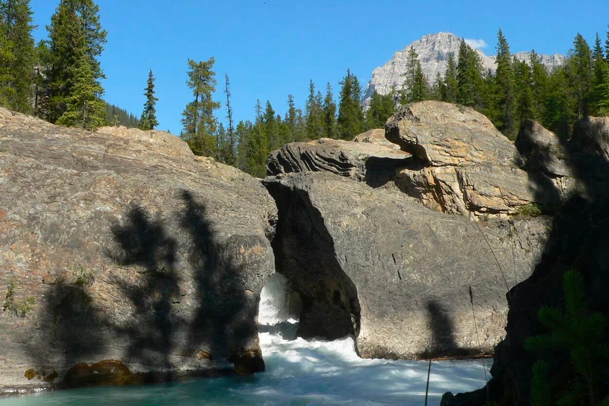 As you make your way back to Golden, don’t forget to take a detour and witness the awe-inspiring Natural Bridge. Here, the powerful Kicking Horse River has carved a path through natural rock formations, creating a captivating spectacle of rushing water.